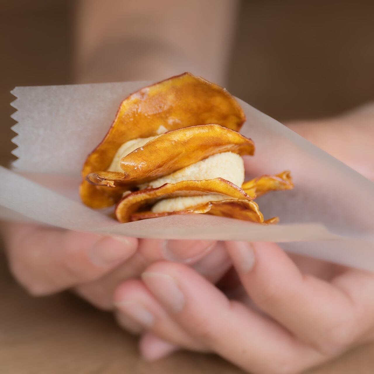 高知県産のさつまいもを薄くスライスして揚げた自家製芋けんぴに、バルサミコソースを絡めたオリジナルのテイストです。
